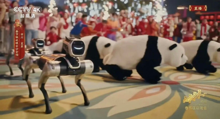 舞台上,宇树科技、松延动力、魔法原子等多个品牌国产机器人亮相,与蔡明相似度极高的仿生人形机器人、上百只以熊猫造型进行表演的四足机器人MagicDog、与易烊千玺、陈小春、罗嘉豪、言承旭一起上场跳舞的MagicBot Z1……
