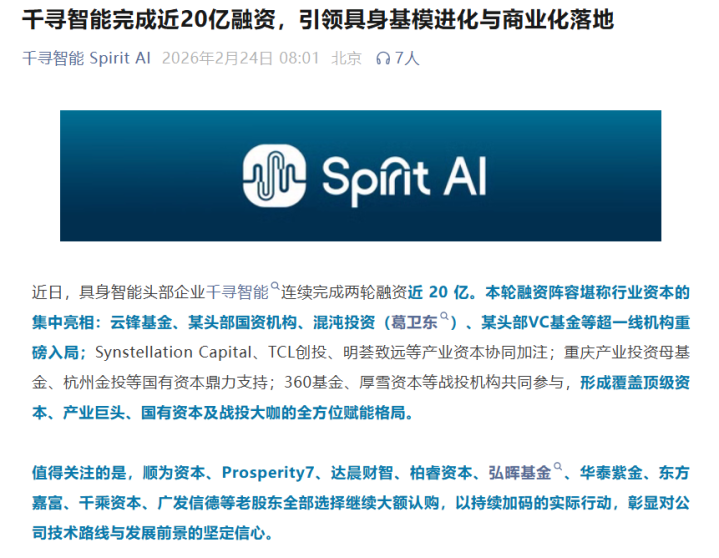 春节的喜庆氛围还未散去,具身智能赛道就传来多个好消息。2月24日,具身智能头部企业千寻智能宣布,于近日完成两轮近20亿元融资,创下2026年以来具身智能领域新高。