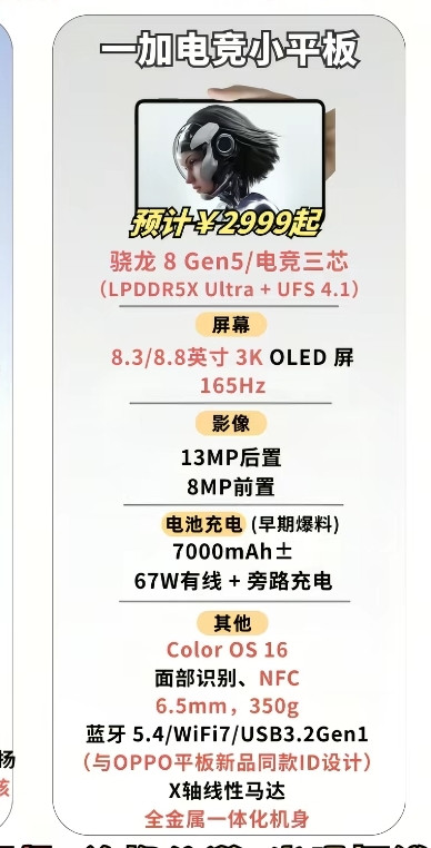 4:一加电竞小平板预计起售价为2999元,这一价格在同配置平板中具有较高性价比,尤其适合追求高性能、高刷新率、长续航的游戏玩家,其与OPPO平板新品同款ID设计,也意味着它在外观和系统体验上将与OPPO生态深度协同,未来可能支持跨设备协同、云游戏、多屏互动等功能,进一步拓展使用场景。