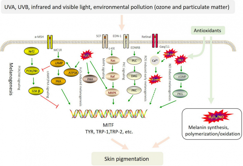 光疗虽然能通过免疫调节、激活黑素细胞等机制促进复色,但其使用的紫外线在治疗同时也会诱导皮肤产生活性氧(ROS)。当ROS积累过多,超过皮肤自身的清除能力时,便会加剧氧化应激反应。这一过程会直接损伤黑素细胞的DNA,抑制黑色素合成关键蛋白MITF的表达,甚至耗竭毛囊中的黑素干细胞储备,导致黑素细胞修复能力下降。