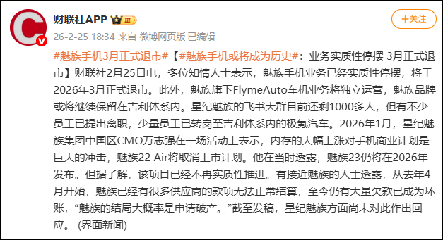 多位知情人士表示,魅族手机业务已经实质性停摆,将于2026年3月正式退市。此外,魅族旗下FlymeAuto车机业务将独立运营,魅族品牌或将继续保留在吉利体系内。星纪魅族的飞书大群目前还剩1000多人,但有不少员工已提出离职,少量员工已转岗至吉利体系内的极氪汽车。